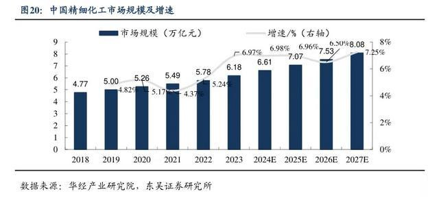 【精细化工】作为化工行业中附加值最高的领域,其产品广泛应用于医药、电子、农业等领域。2024年中国精细化工市场规模约为6.1万亿元,预计2027年市场规模有望达到11万亿元。近年来,【精细化工】行业在技术创新和市场需求的推动下快速发展。